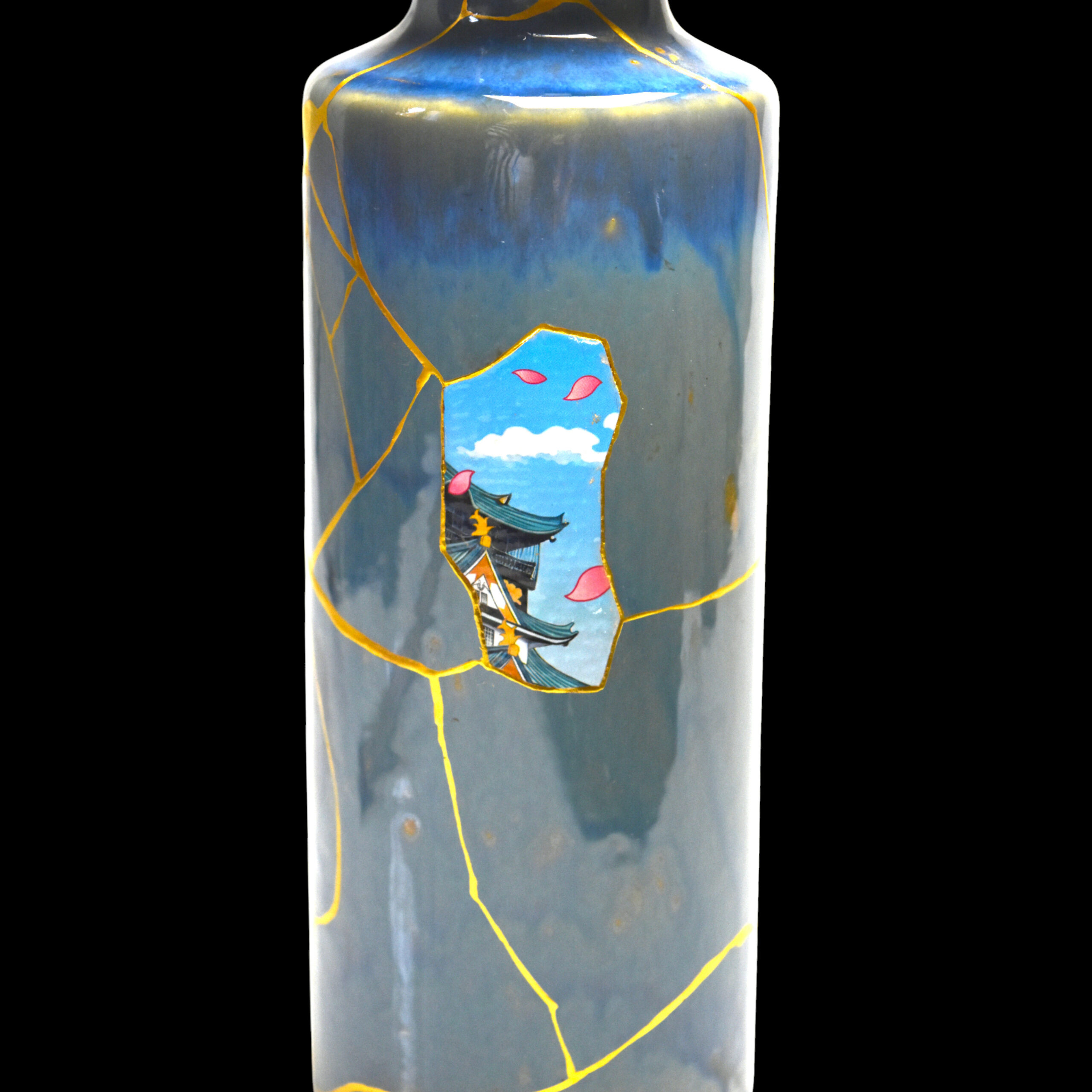At the heart of this poetic restoration lies a captivating singularity that makes this vase absolutely unique. Where a simple gold repair would have sufficed, a fragment of an illustration (in a manga/anime style, not a photograph) of Osaka Castle (amidst a cherry blossom storm) has been delicately inlaid into the main fracture.