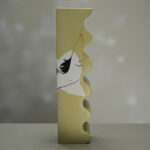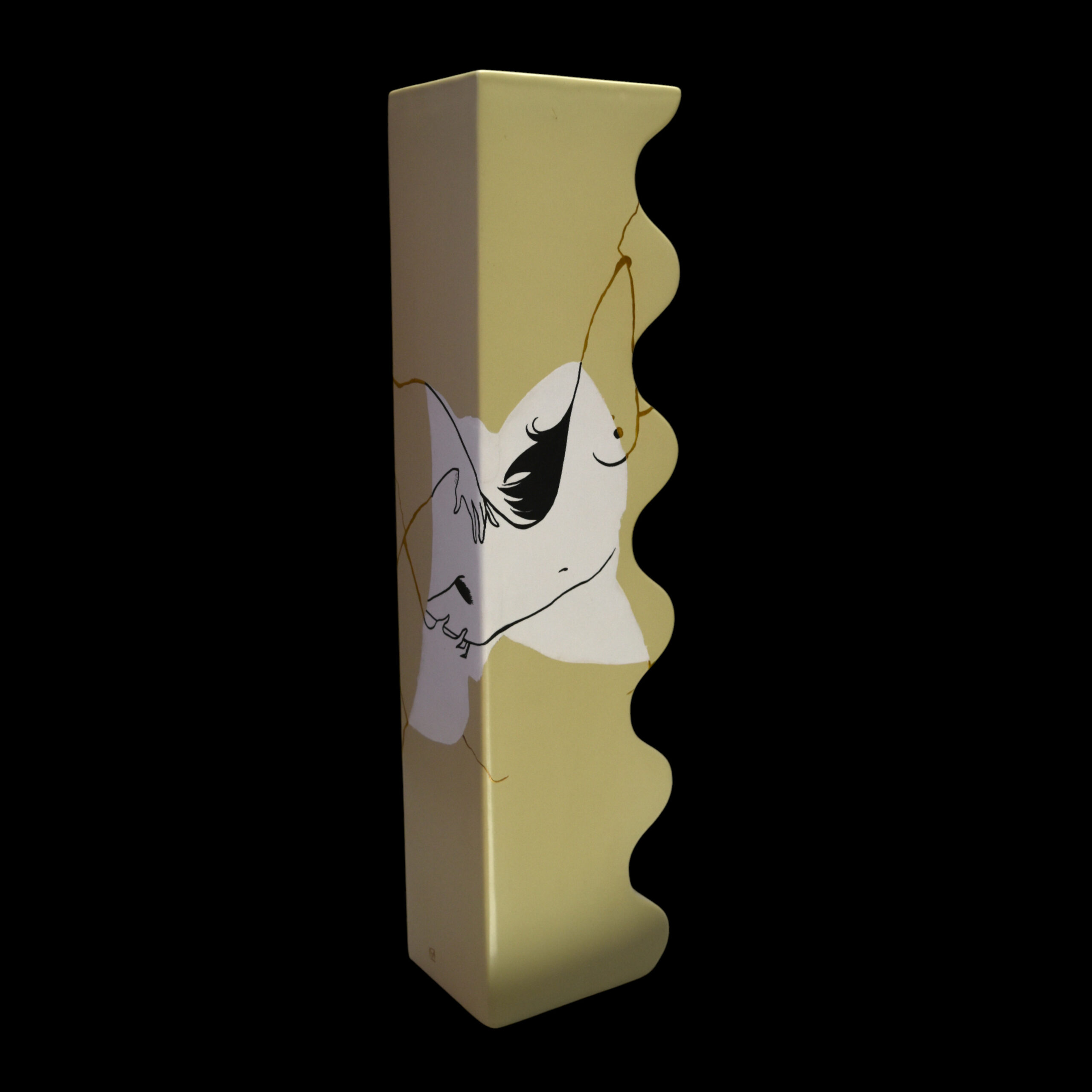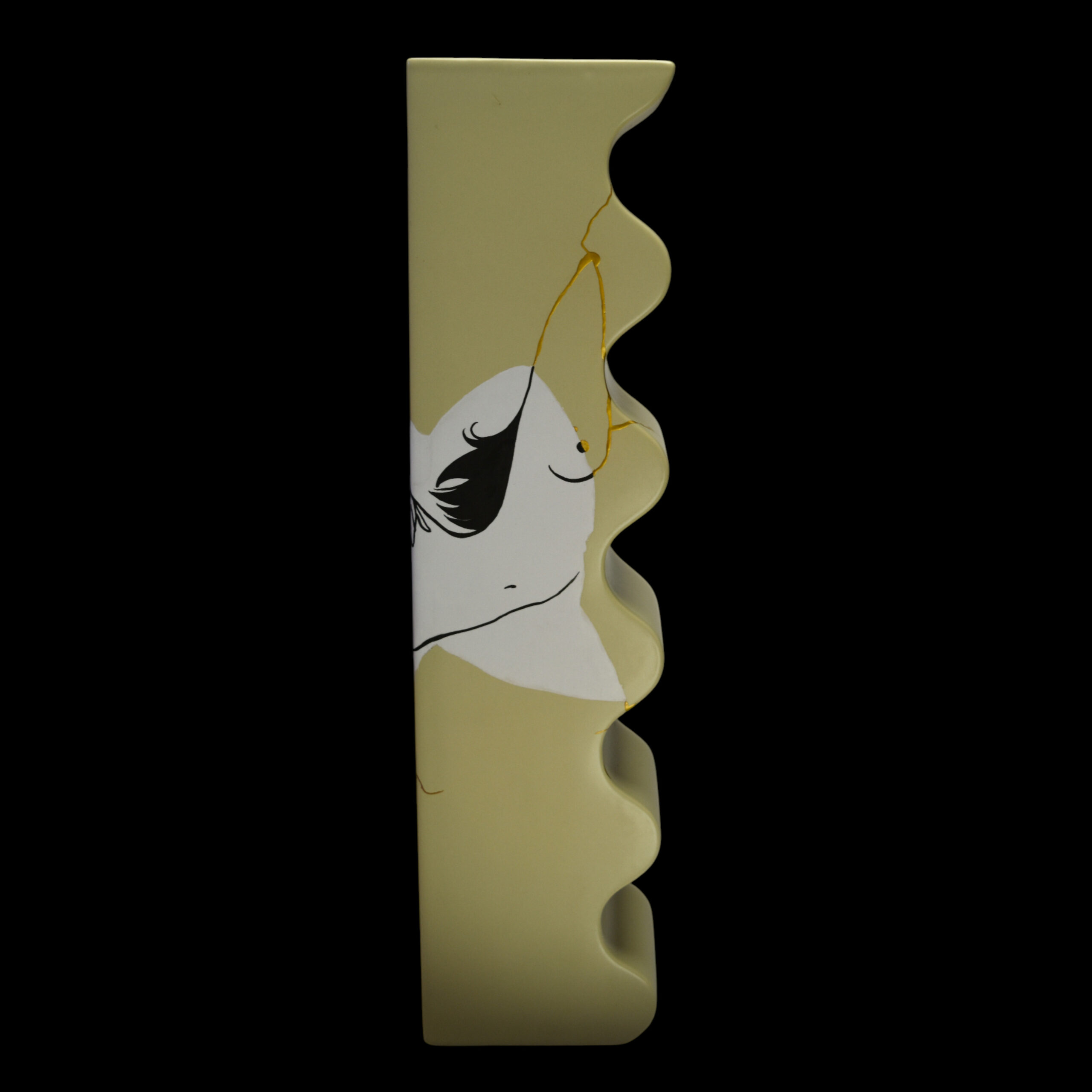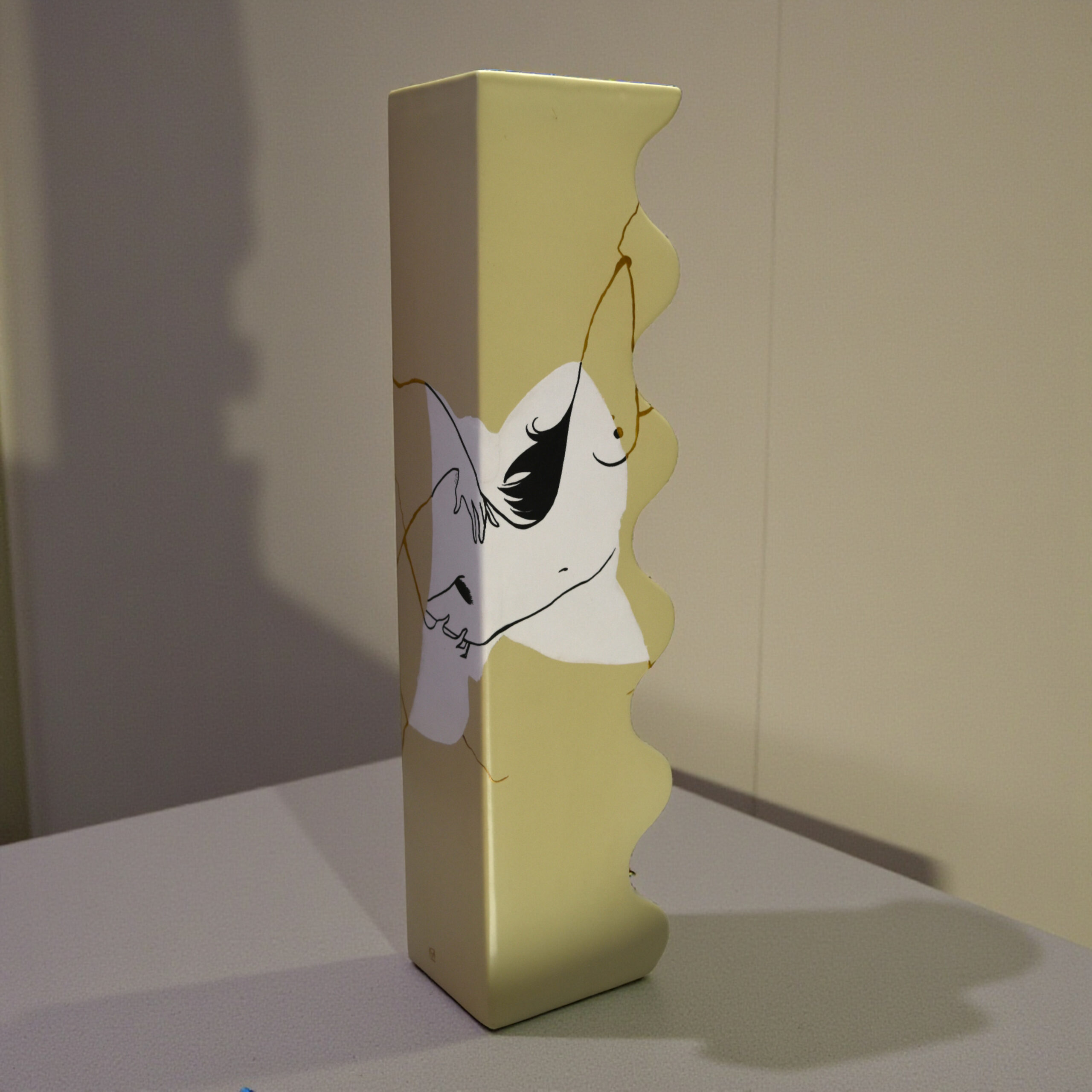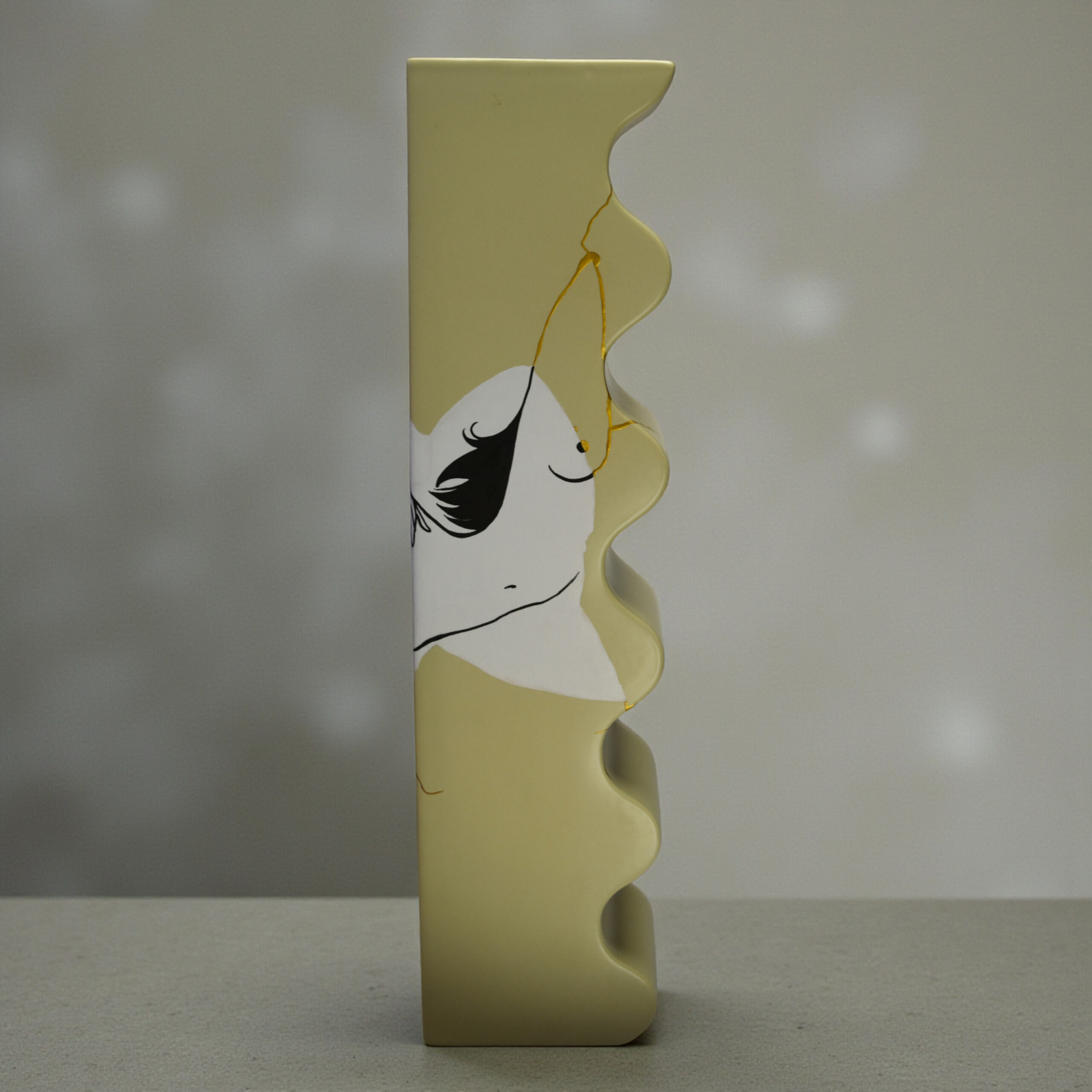 The drawing and the fracture intertwine: the emblematic curves of her illustrated bodies extend and dialogue with the gold lines, creating a stunning visual unity. “Hot Voltige” celebrates the beauty of the accident and transforms the history of its breakage into a definitive work of art.
