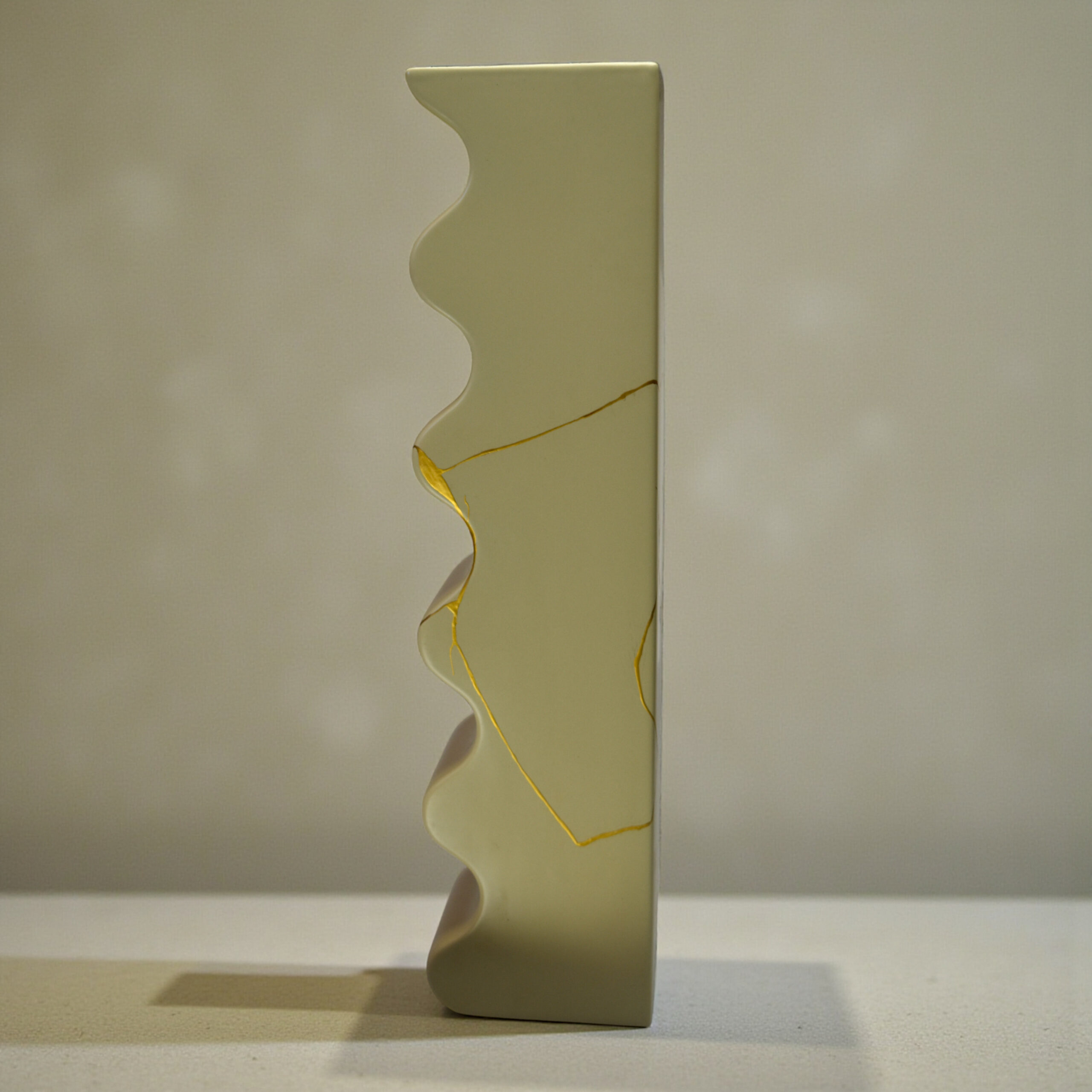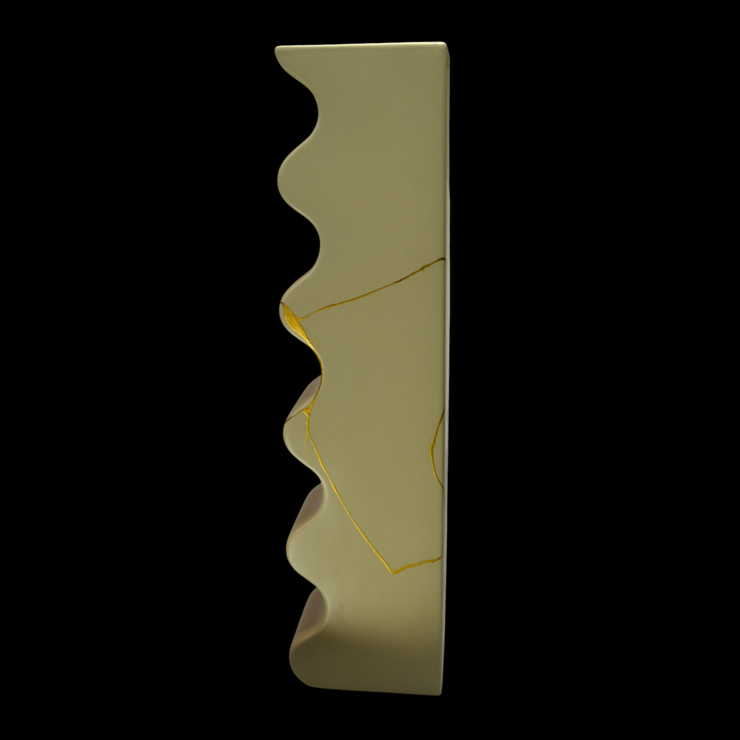 Initially broken, the piece was metamorphosed through the exceptional dialogue between two expert crafts. Myriam Greff restored the structure by applying the ancestral Japanese technique of Kintsugi with 24-karat gold, turning the cracks into precious scars.