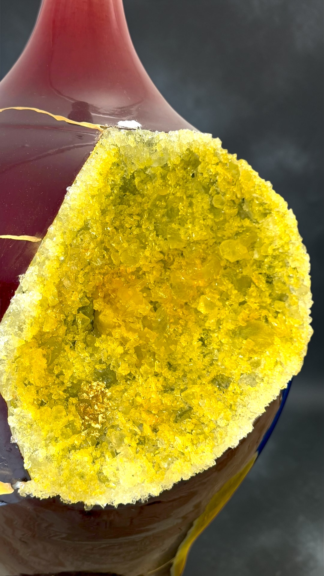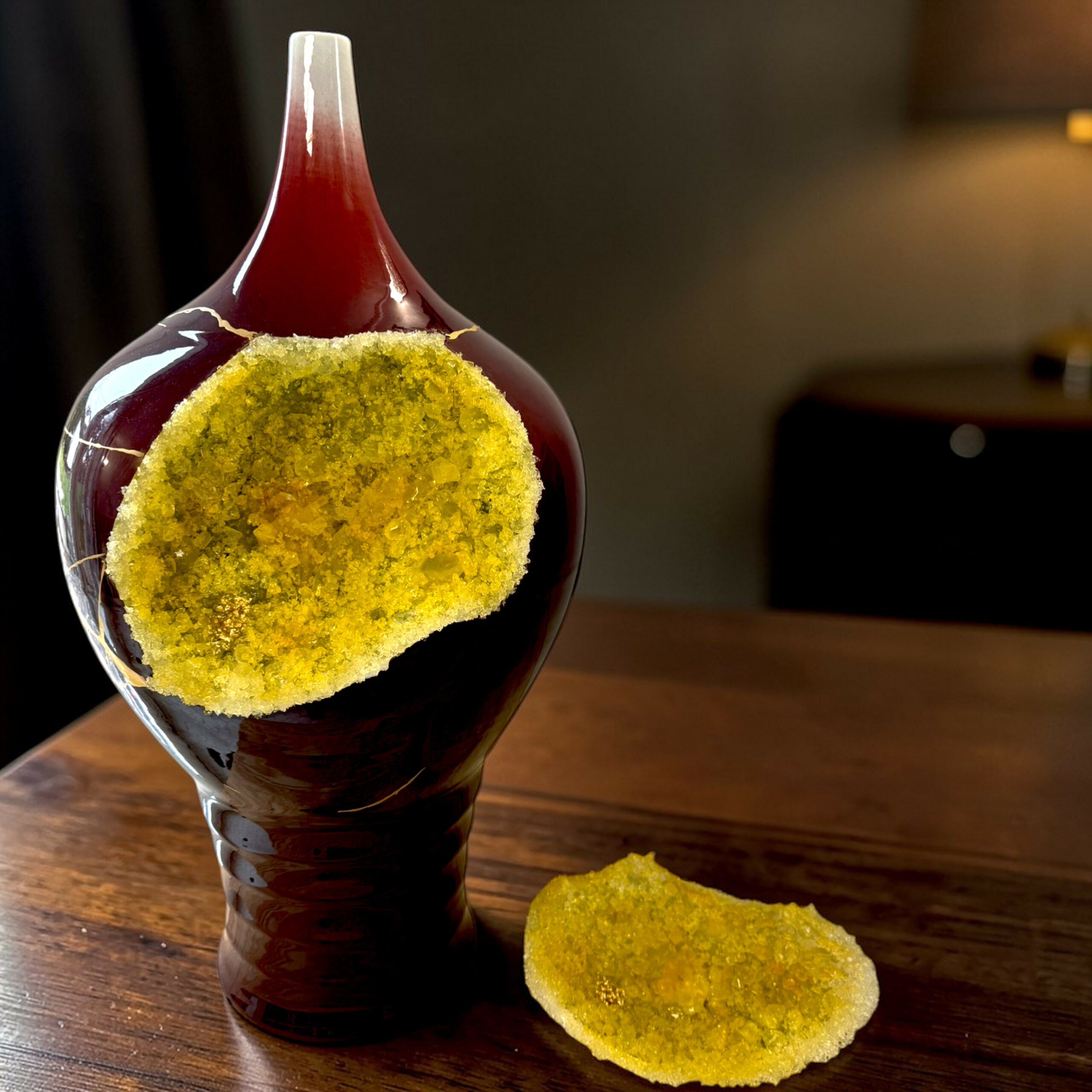 Created from a 90 cm Chinese porcelain vase finished in a deep and luminous oxblood glaze, the piece has been opened to reveal at its core a citrine-colored glass geode, like a nucleus of light long held within the form. The detached shard has been preserved and transformed into a geode in its own right, allowing the rupture to remain fully visible in all its significance.